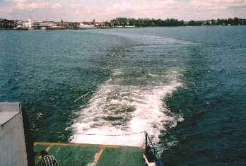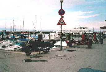 Als ich am Mittwoch aufstehe, werde ich von strahlendem Sonnenschein empfangen. Dass zwischendurch auch noch ein paar Wolken zu sehen sind, kann meine Freude nicht trüben. Die Motorradsachen sind auch endlich trocken. Nach dem Frühstück mache ich mich auf zur Fähre, um auf die andere Seite überzusetzen. Heute geht es nach Friedrichshafen ins Zeppelinmuseum. Entlang der kurvenreichen Bodenseeküste fahre ich nach Friedrichshafen. Bei jetzt trockener Straße und ohne Gepäck macht das Kurvenräubern richtig Spaß. Ich erreiche die Stadt und stelle mein Motorrad platzsparend am Rande einer Fußgängerzone ab, so dass es nicht im Weg steht. Jetzt ist erst mal ein kleiner Stadtbummel angesagt. Mein Weg führt mich schließlich zum Hafen, wo gerade eine Fähre Richtung Schweiz ablegt.
