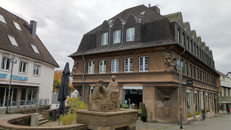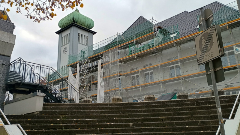 Das Rathaus war gut verpackt. Offensichtlich wurde es gerade renoviert. Viel war hier nicht los. Die meisten Menschen tummelten sich im neuen Einkaufszentrum direkt an der Ruhr.